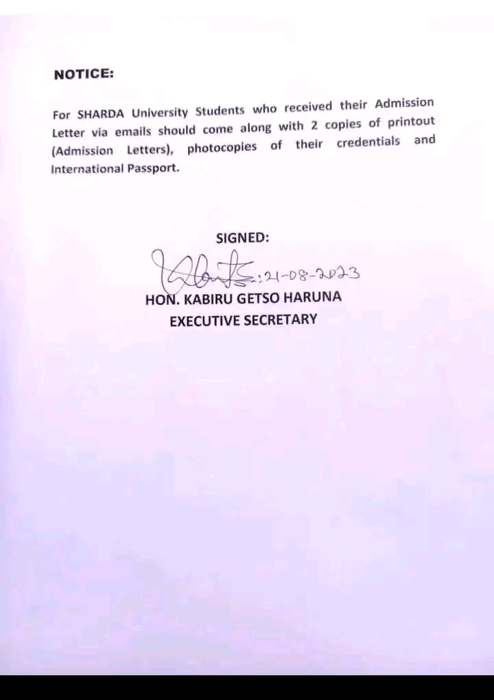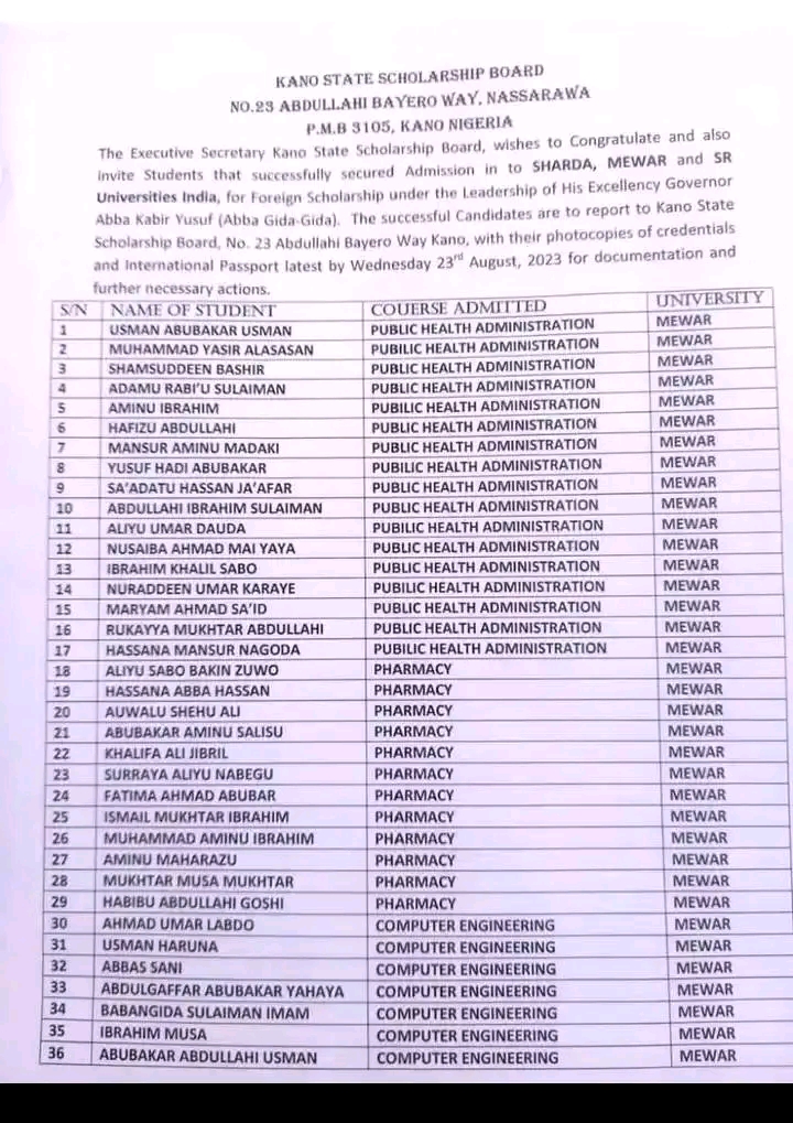 Sanarwar tace ɗaliban da suka samu nasara, za su je hukumar ba da tallafin karatu ta jihar Kano mai lamba 23 Abdullahi Bayero way, tare da kwafin admission letter guda biyu, da fasfo na kasa da kasa da sauran takardun a ranar Laraba 23 ga watan Agusta domin tantancewa.