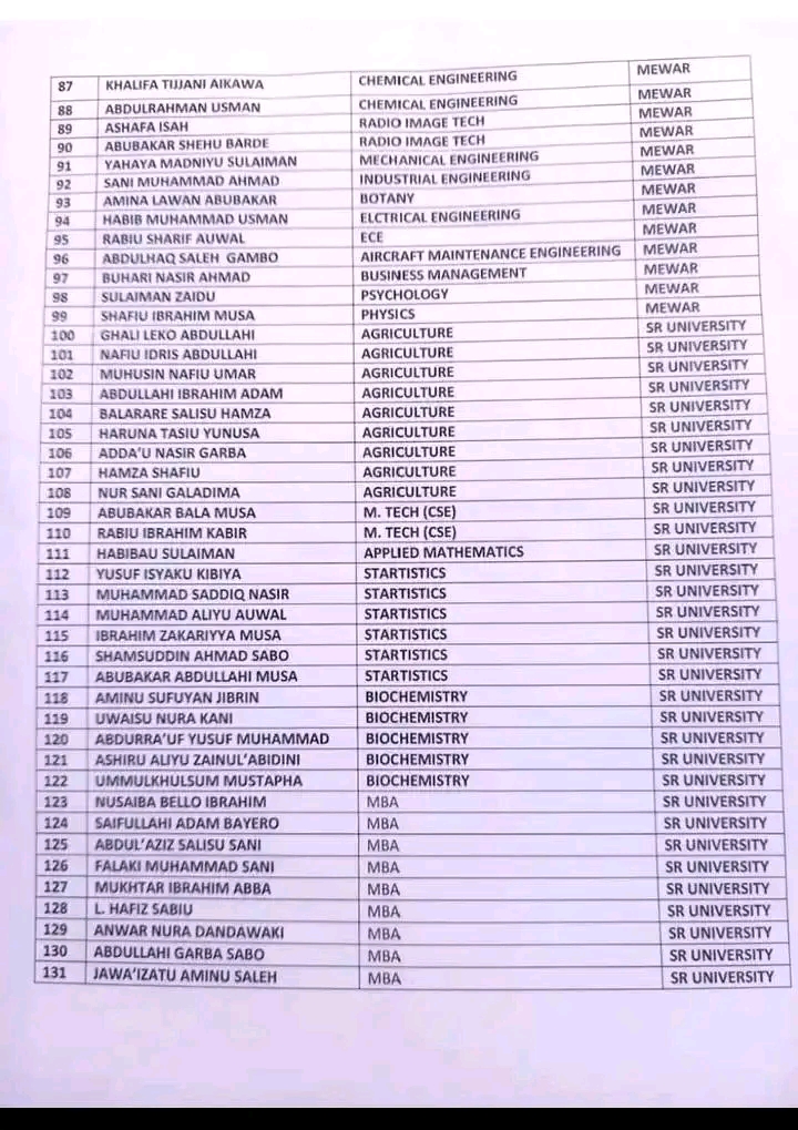 Sanarwar ta fitar da jerin sunayen daliban da suka yi nasarar samun gurbin shiga Jami’ar MEWAR AND SR UNIVERSITIES dake kasar Indiya